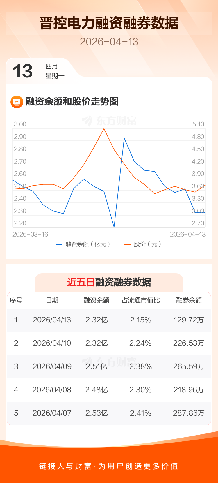 交易所最新数据显示,晋控电力于2026年4月13日获融资买入4306.47万元,融资偿还4265.68万元,当日融资净买入40.78万元。目前,该股融资余额2.32亿,占流通市值比例为2.15%。