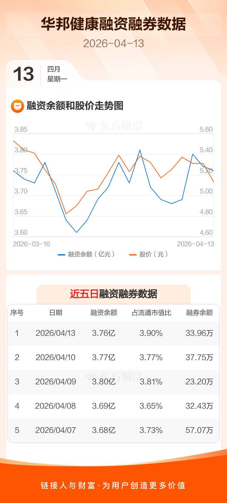 交易所最新数据显示,华邦健康于2026年4月13日获融资买入1527.27万元,融资偿还1620.28万元,当日融资净偿还93.01万元。目前,该股融资余额3.76亿,占流通市值比例为3.90%。