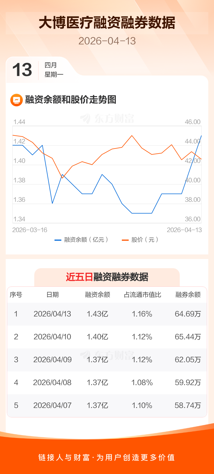 交易所最新数据显示,大博医疗于2026年4月13日获融资买入645.58万元,融资偿还377.48万元,当日融资净买入268.1万元。目前,该股融资余额1.43亿,占流通市值比例为1.16%。