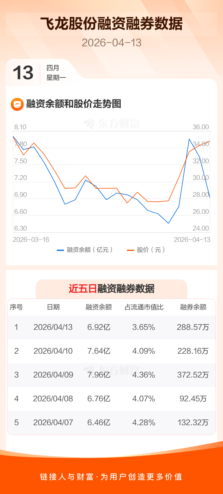 交易所最新数据显示,飞龙股份于2026年4月13日获融资买入1.36亿元,融资偿还2.08亿元,当日融资净偿还7185.39万元。目前,该股融资余额6.92亿,占流通市值比例为3.65%。