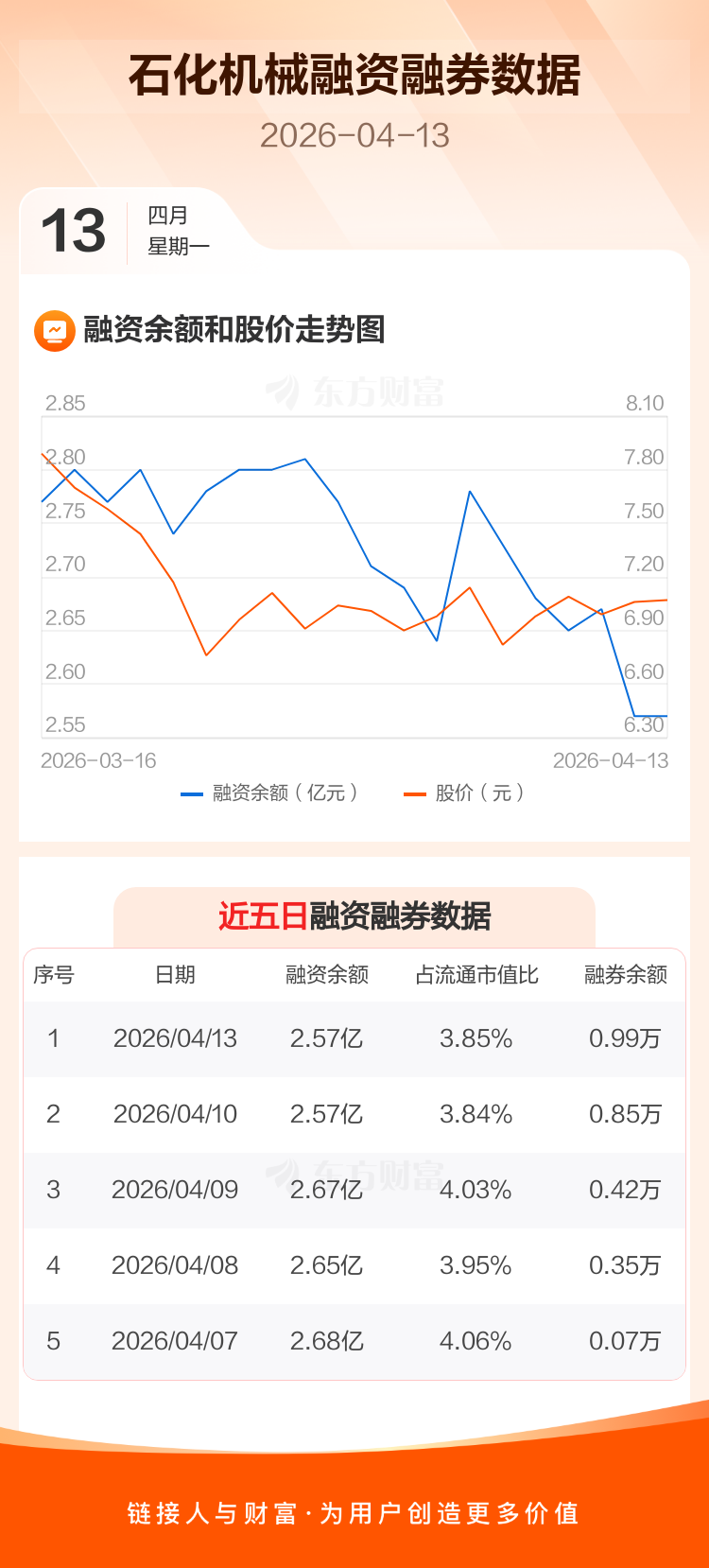 交易所最新数据显示,石化机械于2026年4月13日获融资买入965.86万元,融资偿还873.20万元,当日融资净买入92.65万元。目前,该股融资余额2.57亿,占流通市值比例为3.85%。