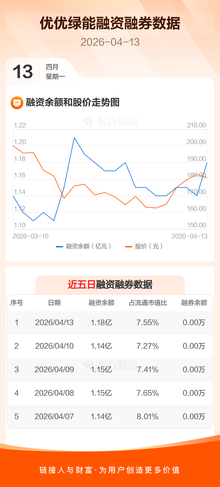 交易所最新数据显示,优优绿能于2026年4月13日获融资买入736.54万元,融资偿还413.84万元,当日融资净买入322.7万元。目前,该股融资余额1.18亿,占流通市值比例为7.55%。