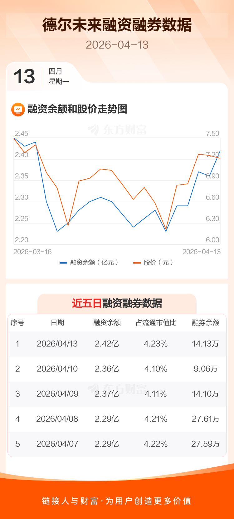 交易所最新数据显示,德尔未来于2026年4月13日获融资买入1970.89万元,融资偿还1345.25万元,当日融资净买入625.64万元。目前,该股融资余额2.42亿,占流通市值比例为4.23%。