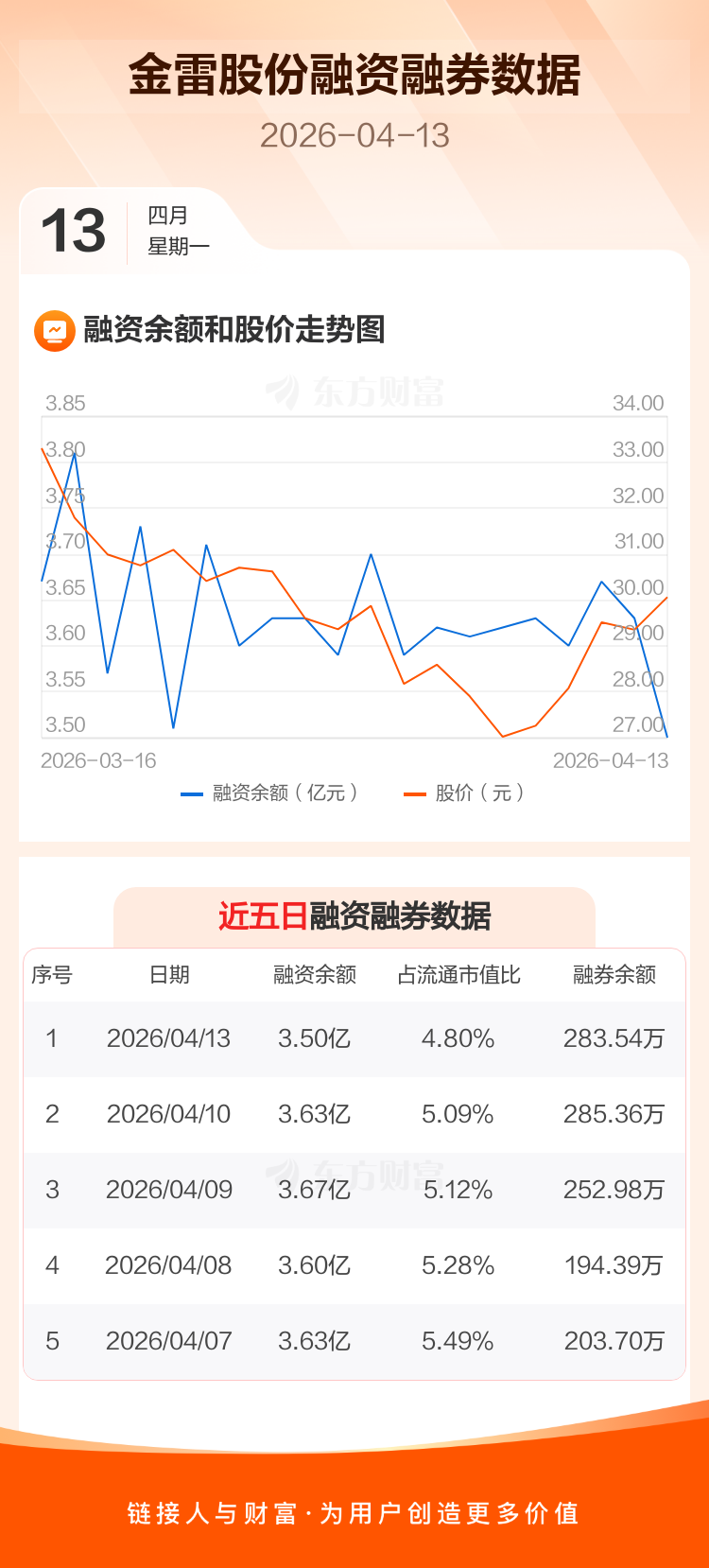交易所最新数据显示,金雷股份于2026年4月13日获融资买入3030.74万元,融资偿还4294.05万元,当日融资净偿还1263.31万元。目前,该股融资余额3.50亿,占流通市值比例为4.80%。