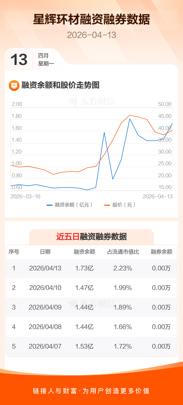 交易所最新数据显示,星辉环材于2026年4月13日获融资买入6893.39万元,融资偿还4268.46万元,当日融资净买入2624.94万元。目前,该股融资余额1.73亿,占流通市值比例为2.23%。