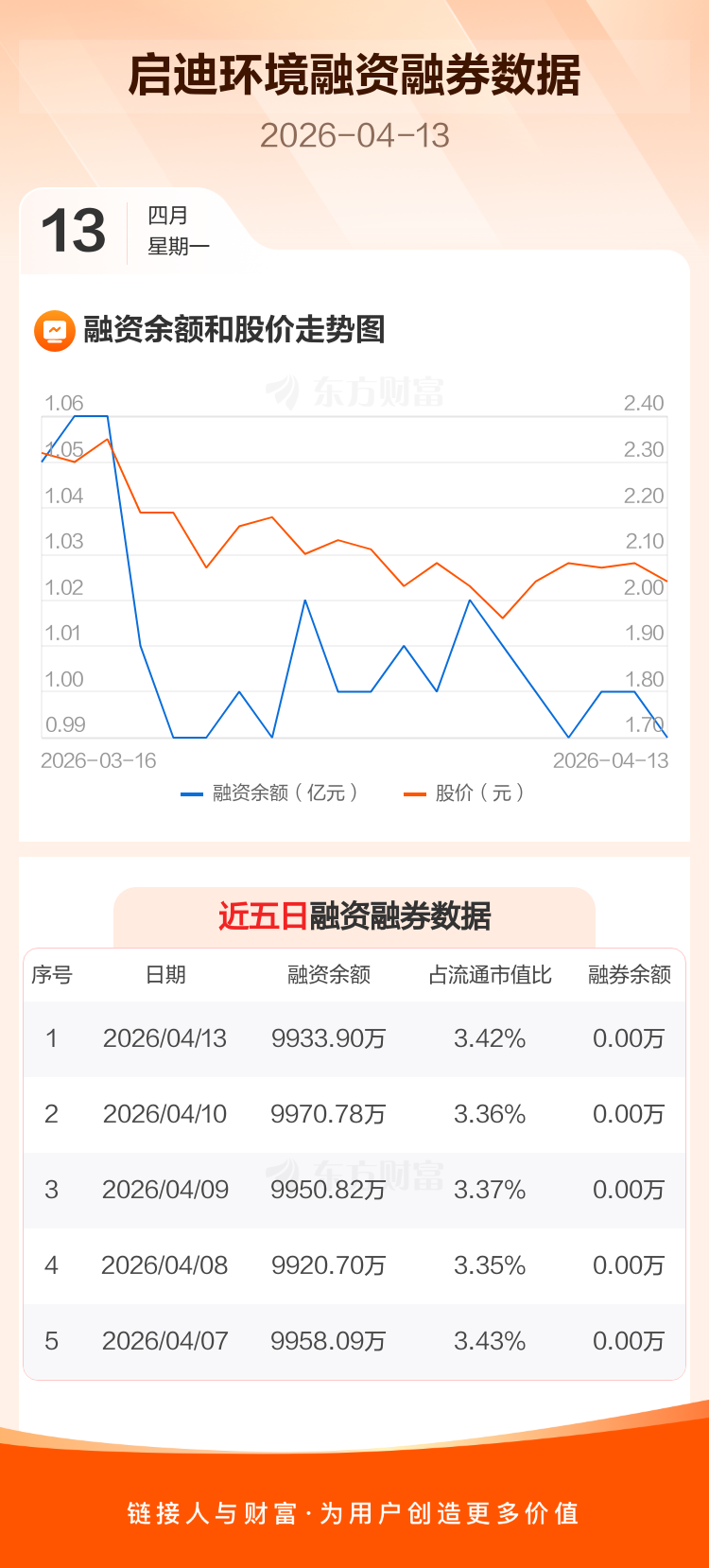 交易所最新数据显示,启迪环境于2026年4月13日获融资买入113.76万元,融资偿还150.63万元,当日融资净偿还36.88万元。目前,该股融资余额9933.90万,占流通市值比例为3.42%。