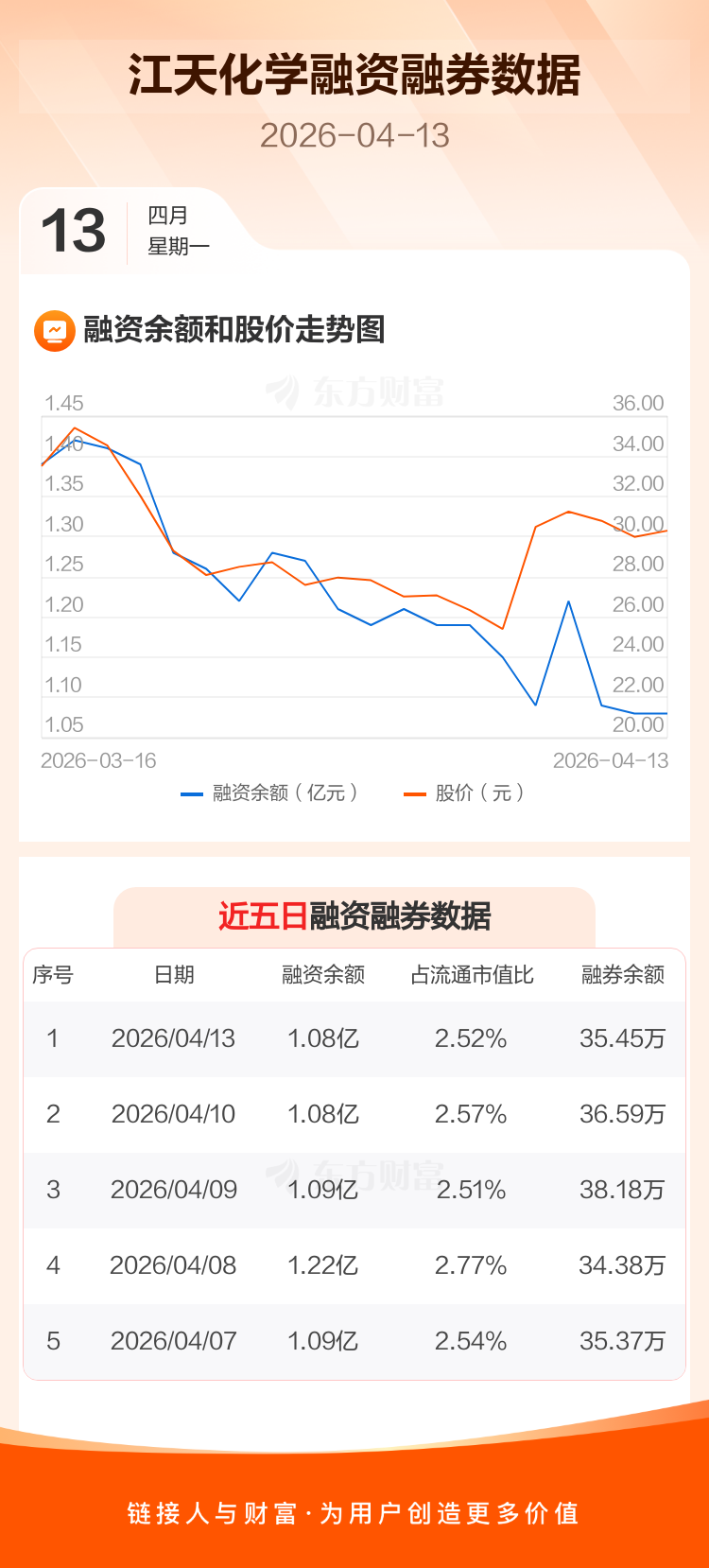 交易所最新数据显示,江天化学于2026年4月13日获融资买入1613.93万元,融资偿还1699.45万元,当日融资净偿还85.52万元。目前,该股融资余额1.08亿,占流通市值比例为2.52%。