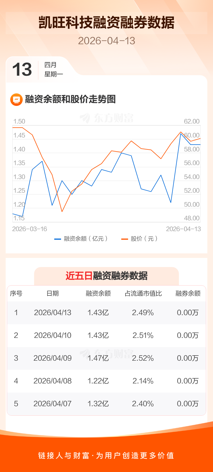 交易所最新数据显示,凯旺科技于2026年4月13日获融资买入3067.08万元,融资偿还3081.87万元,当日融资净偿还14.79万元。目前,该股融资余额1.43亿,占流通市值比例为2.49%。