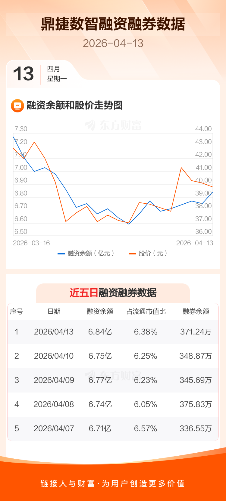 交易所最新数据显示,鼎捷数智于2026年4月13日获融资买入3010.47万元,融资偿还2108.31万元,当日融资净买入902.16万元。目前,该股融资余额6.84亿,占流通市值比例为6.38%。