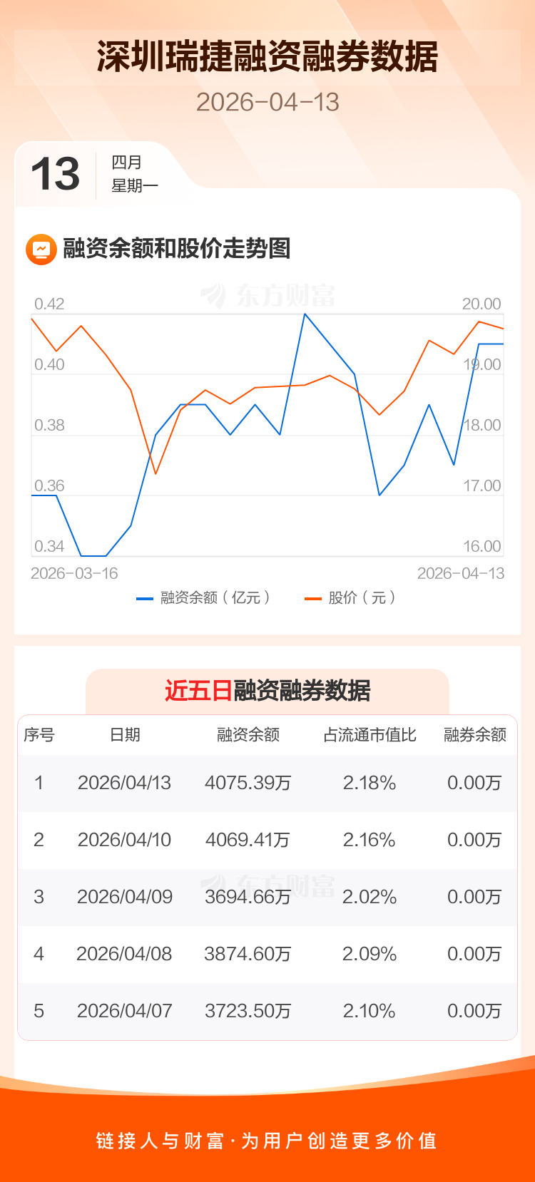 交易所最新数据显示,深圳瑞捷于2026年4月13日获融资买入299.97万元,融资偿还293.99万元,当日融资净买入5.98万元。目前,该股融资余额4075.39万,占流通市值比例为2.18%。