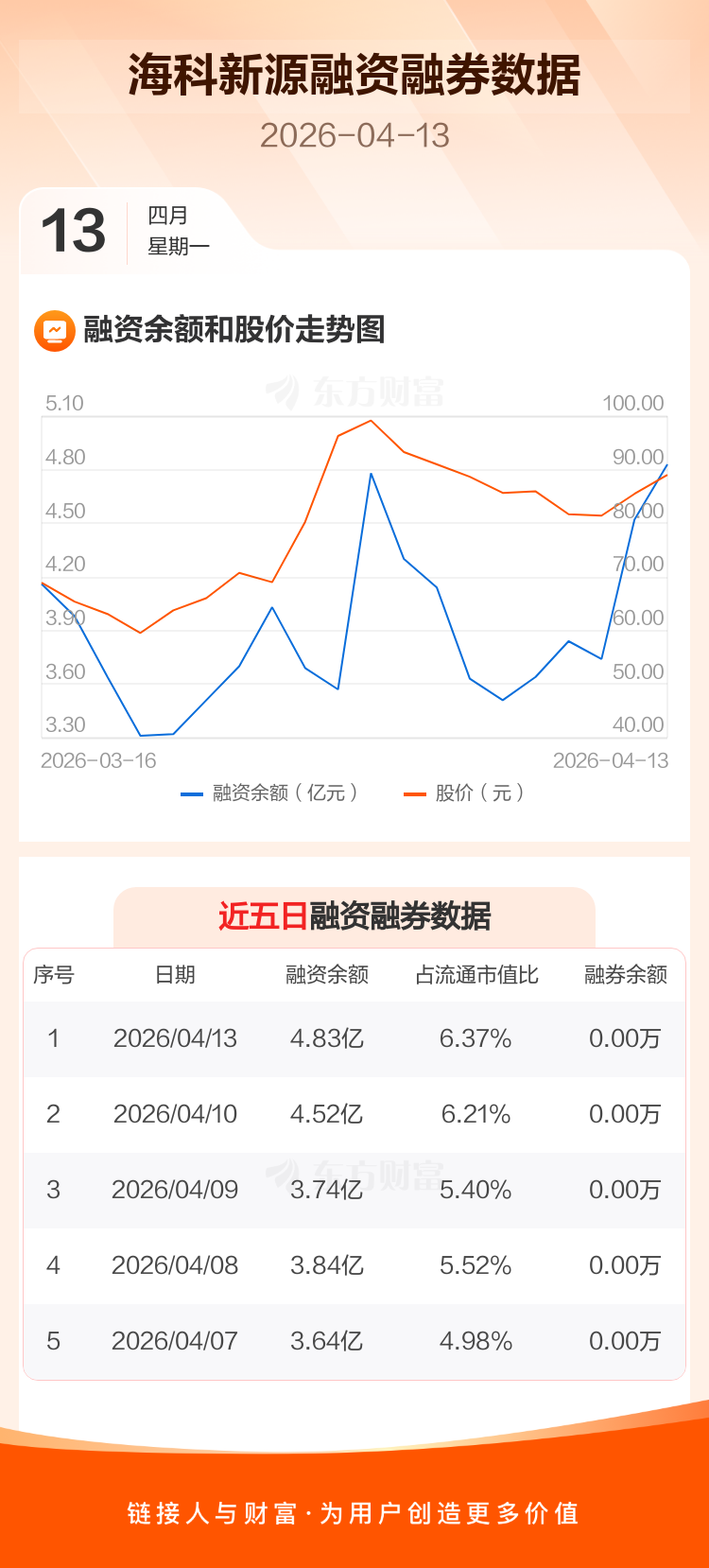 交易所最新数据显示,海科新源于2026年4月13日获融资买入2.65亿元,融资偿还2.34亿元,当日融资净买入3066.9万元。目前,该股融资余额4.83亿,占流通市值比例为6.37%。