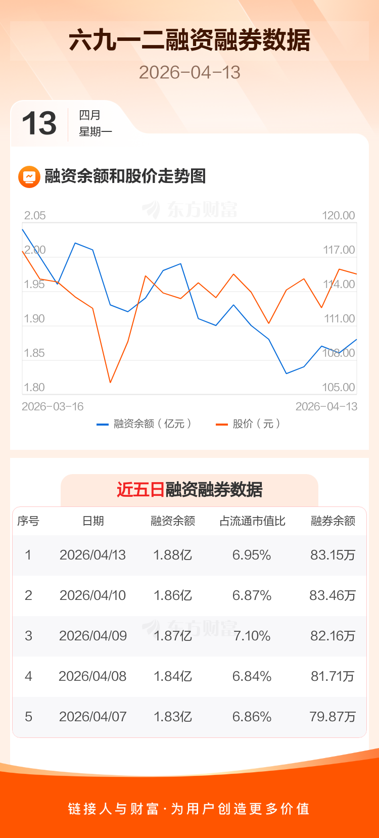 交易所最新数据显示,六九一二于2026年4月13日获融资买入754.20万元,融资偿还603.37万元,当日融资净买入150.84万元。目前,该股融资余额1.88亿,占流通市值比例为6.95%。