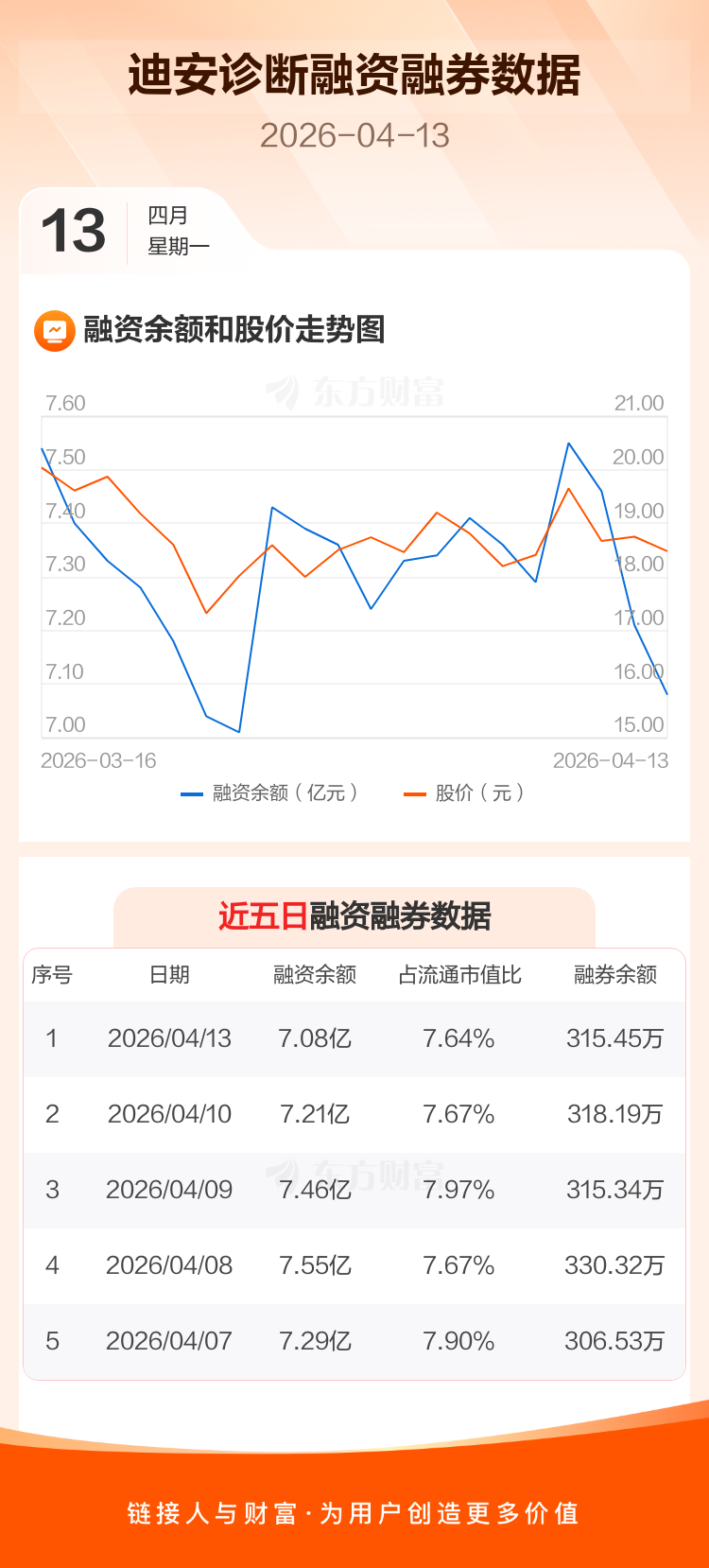 交易所最新数据显示,迪安诊断于2026年4月13日获融资买入2003.68万元,融资偿还3369.13万元,当日融资净偿还1365.45万元。目前,该股融资余额7.08亿,占流通市值比例为7.64%。