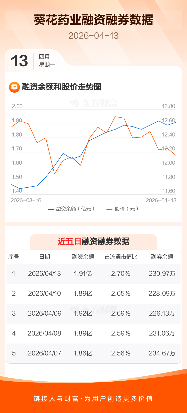 交易所最新数据显示,葵花药业于2026年4月13日获融资买入404.03万元,融资偿还193.95万元,当日融资净买入210.08万元。目前,该股融资余额1.91亿,占流通市值比例为2.70%。