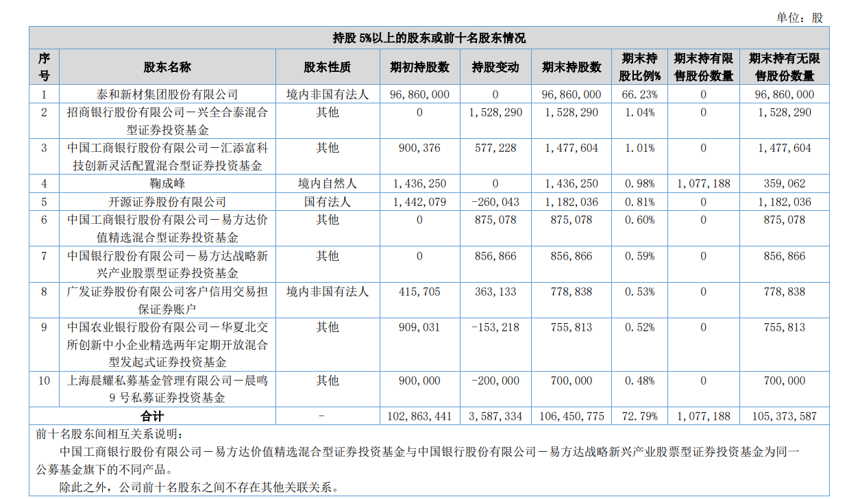 股权结构方面,民士达控股股东泰和新材持股9686万股,持股比例66.23%,保持不变。但进入2026年以来,在其前十大股东中,机构投资者出现明显调仓,出现了小幅减持或增持的分化操作,这反映出市场对其短期估值的分歧。