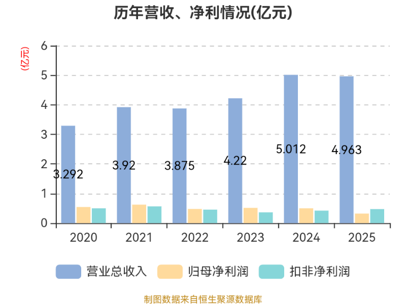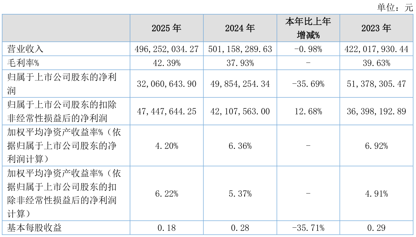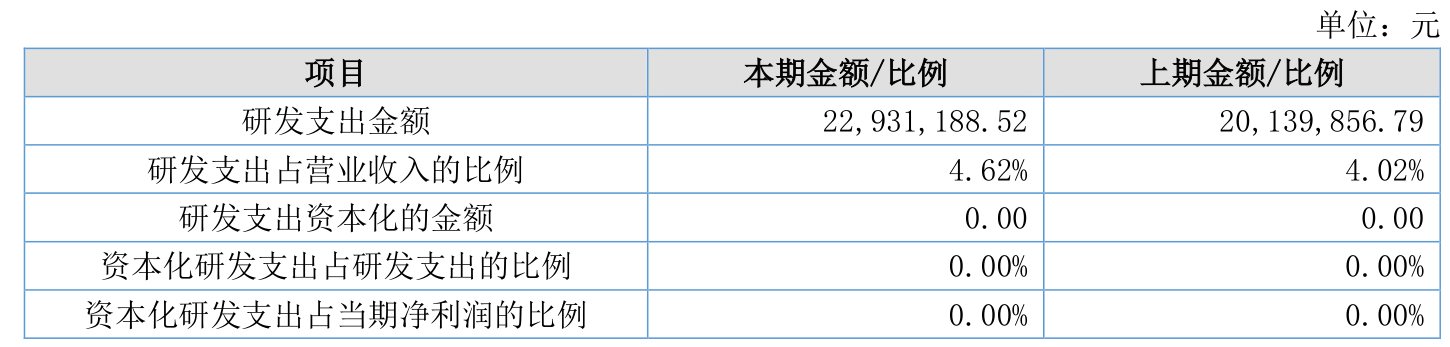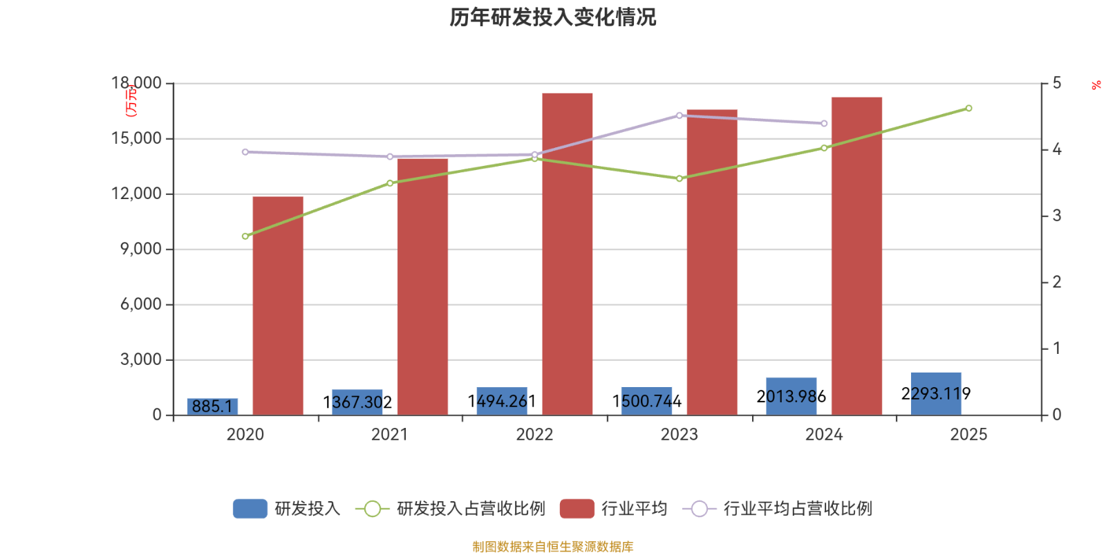 2025年全年,公司研发投入金额为2293.12万元,同比增长13.86%;研发投入占营业收入比例为4.62%,相比上年同期上升0.6个百分点。此外,公司全年研发投入资本化率为0%。