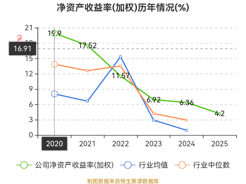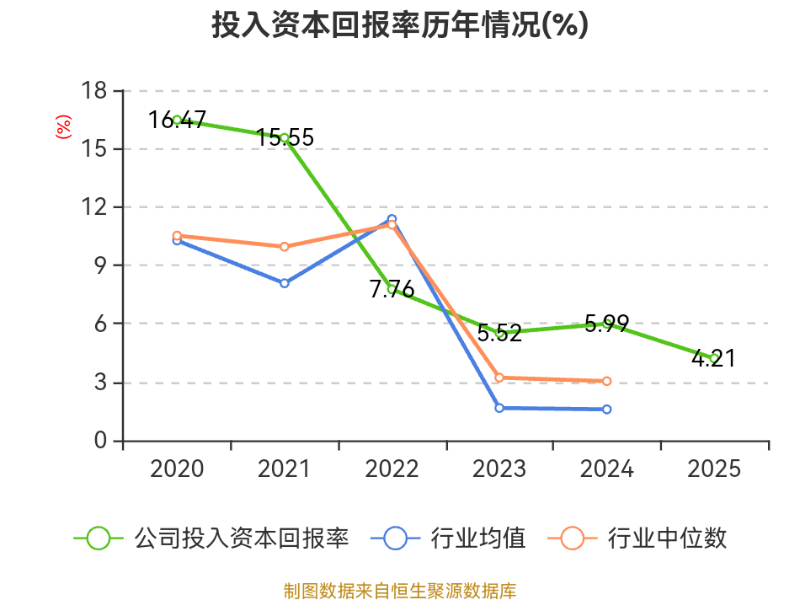 数据显示,2025年公司加权平均净资产收益率为4.2%,较上年同期下降2.16个百分点。公司2025年投入资本回报率为4.21%,较上年同期下降1.78个百分点。