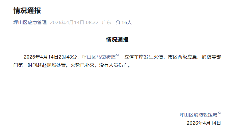 此前,坪山区消防救援局发文称:2026年4月14日2时48分,坪山区马峦街道一立体车库发生火情,市区两级应急、消防等部门第一时间赶赴现场处置。火势已扑灭,没有人员伤亡。
