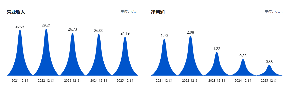 翻阅公司过往年报,公司年报的营收和净利表现均自2023年起持续下滑,已经连续三年双双下跌。目前2025年的净利已经跌至1亿元以下,仅为2022年的四分之一。