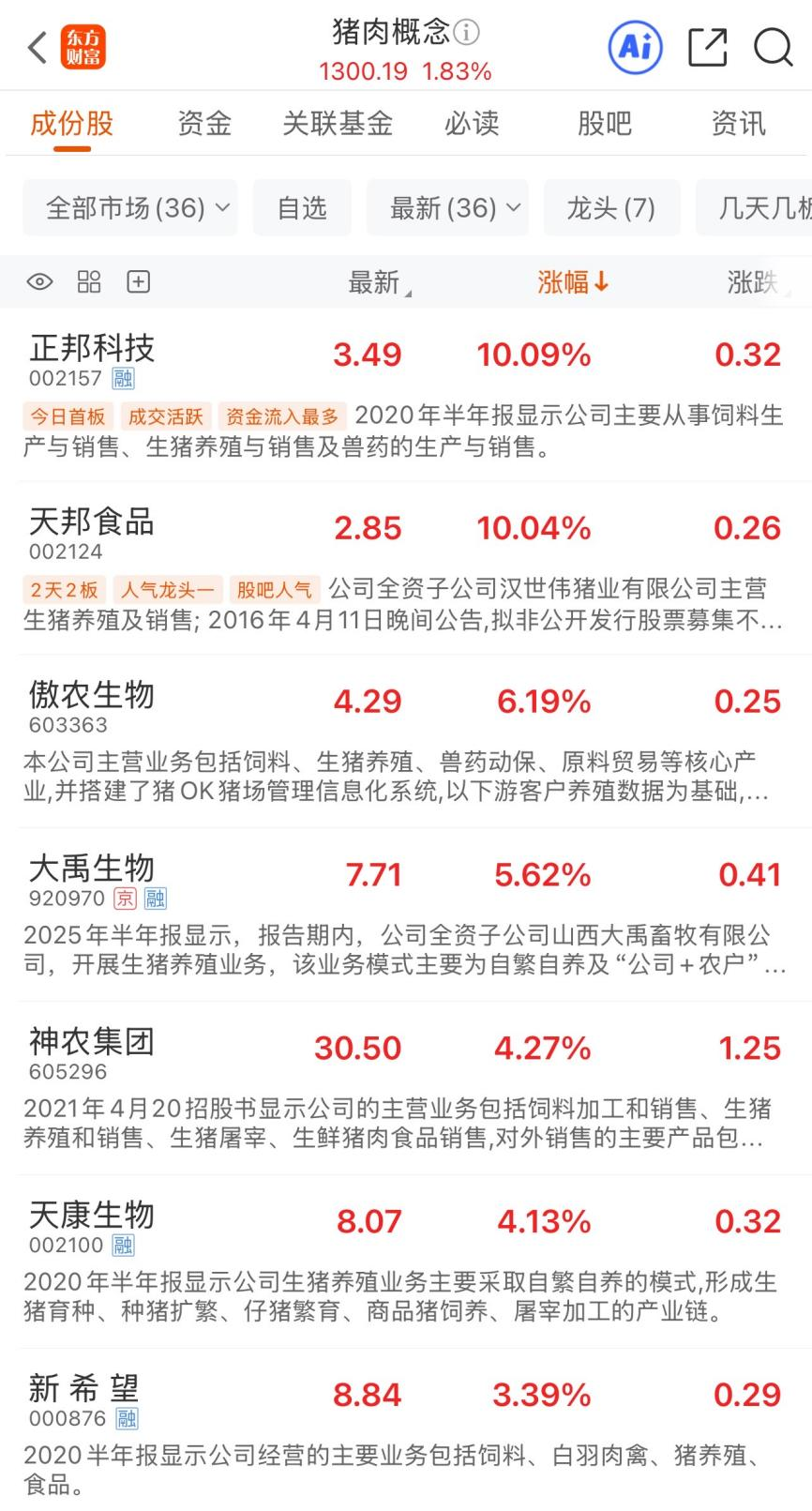 继昨日大涨之后,4月14日,A股猪肉概念再度异动,截至早间收盘,板块上涨1.83%,涨幅居概念板块前列。个股方面,正邦科技、天邦食品涨停,傲农生物涨超6%,大禹生物涨超5%,神农集团、天康生物涨超4%,新希望、巨星农牧、牧原股份、东瑞股份、唐人神、新五丰、温氏股份等多股涨超2%。