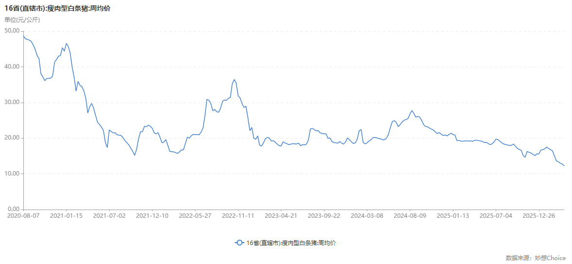 现货方面,据农业农村部信息中心和山东卓创资讯股份有限公司联合监测,2026年第15周(即2026年4月7日—4月10日),16省(直辖市)瘦肉型白条猪肉出厂价格总指数的周平均值为每公斤12.24元,环比下跌3.9%,同比下跌35.9%,较上周跌幅扩大2.0个百分点。