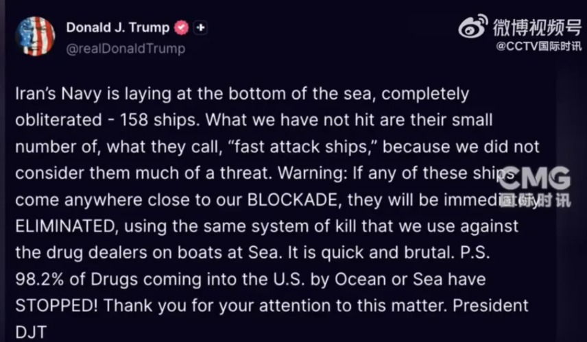 美国总统特朗普4月13日在社交媒体发帖称,一旦伊朗的“快速攻击艇”靠近美军的封锁线,美军将立即予以“歼灭”,其手段同美军在海上打击贩毒船只时使用的击杀系统一样。