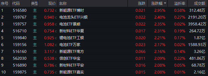 ETF方面,新能源主题基金集体走强。新能源ETF博时以2.95%的涨幅位居榜首,电池龙头ETF兴银上涨2.4%,电池ETF景顺上涨2.35%,新材料ETF华夏上涨2.31%,锂电池ETF工银上涨2.21%。稀有金属ETF同步上涨,广发、华富、嘉实、工银旗下产品涨幅均在1.9%以上。