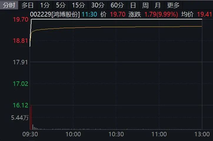 算力产业链早间集体大涨,其中鸿博股份(002229)开盘仅约1分钟垂直涨停。