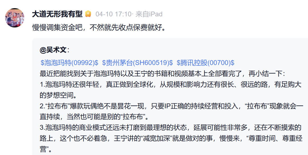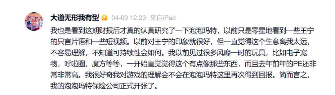 4月9日,段永平公开表示,“我的泡泡玛特保险公司正式开张了”。