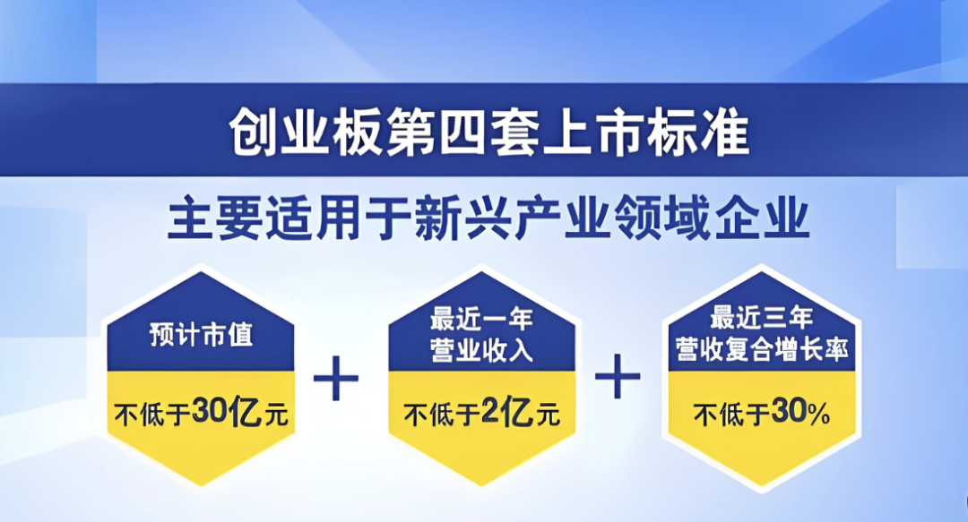 一是“预计市值不低于30亿元,最近一年营业收入不低于2亿元,最近三年营收复合增长率不低于30%”,主要适用于新兴产业领域具有高成长潜力的企业;
