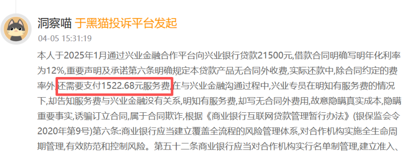 其中,“隐形费用”是其惯用的操作手法。一位用户在黑猫平台投诉称,“自己通过兴业金融合作平台借款21500元,还款过程中除了合同规定的利息之外,还被强行收取1522.68元的服务费。”