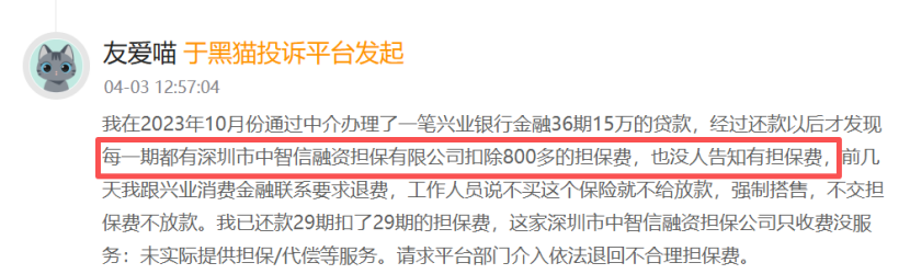 还有一位用户表示,“他于2023年10月份通过中介办理了一笔兴业银行金融36期15万元的贷款,经过还款以后才发现每一期都有深圳市中智信融资担保有限公司扣除800多元的担保费,办理时也没人告知他有担保费。”