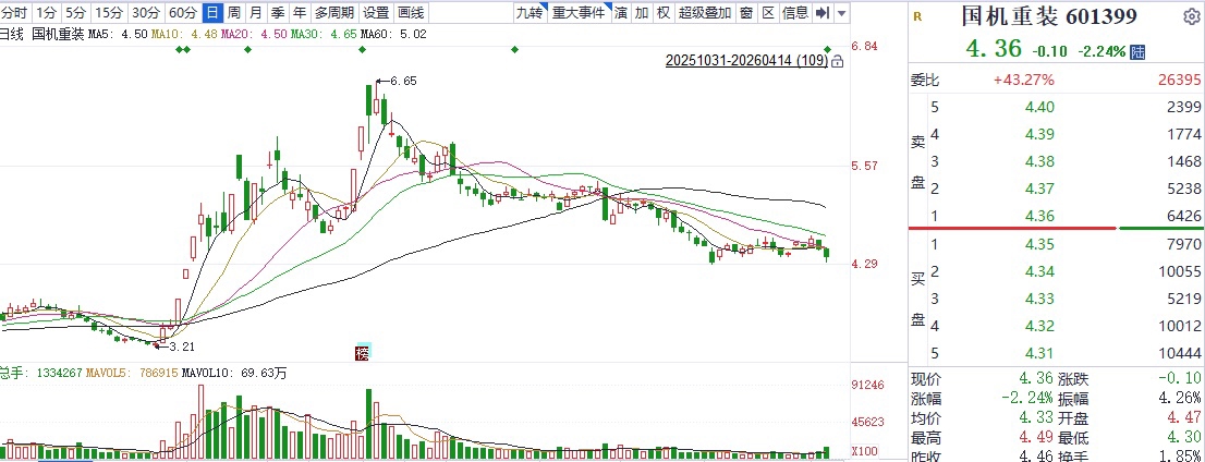 公告“降温”后,国机重装1月12日创出阶段性高点后,股价进入长达三个月的调整当中。截至4月14日收盘,国机重装报收4.36元。就本轮调整来看,从阶段性高点回落至今,国机重装已将之前翻倍行情的超六成涨幅抹去。