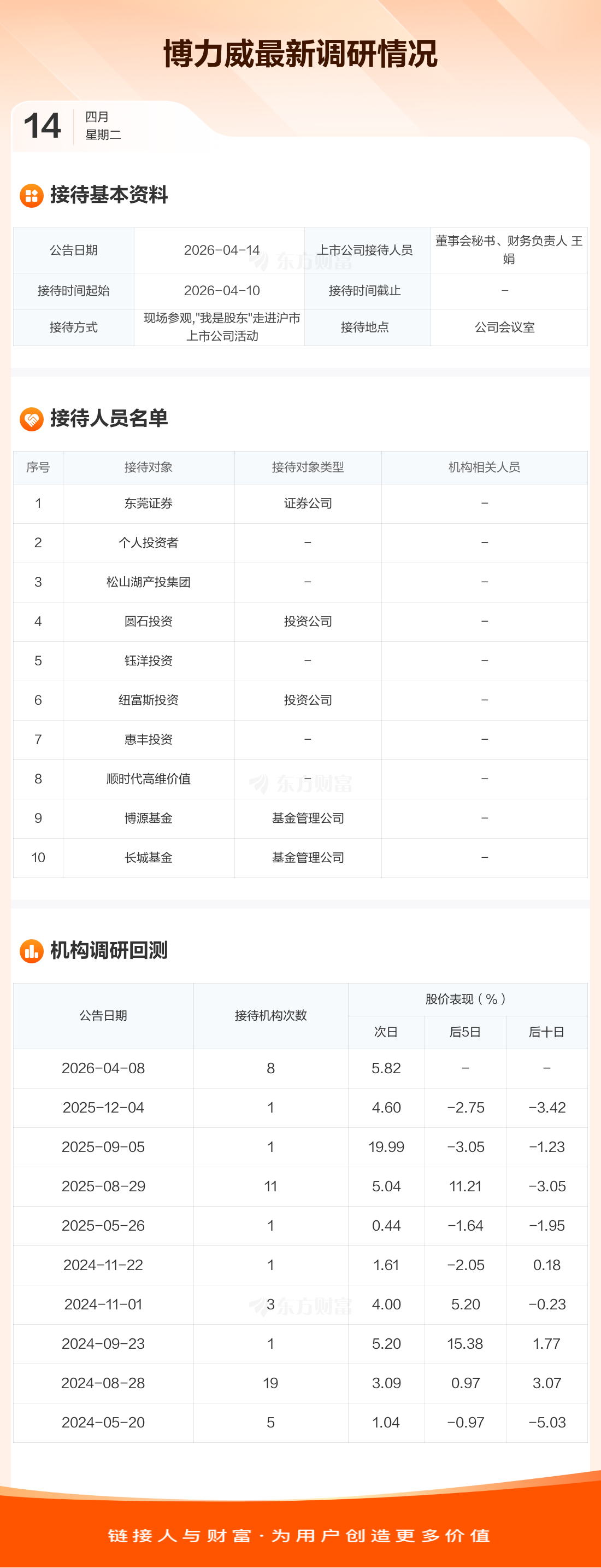 博力威4月14日公告称,4月10日接待东莞证券等10家机构调研。接待人员包括董事会秘书、财务负责人 王娟。