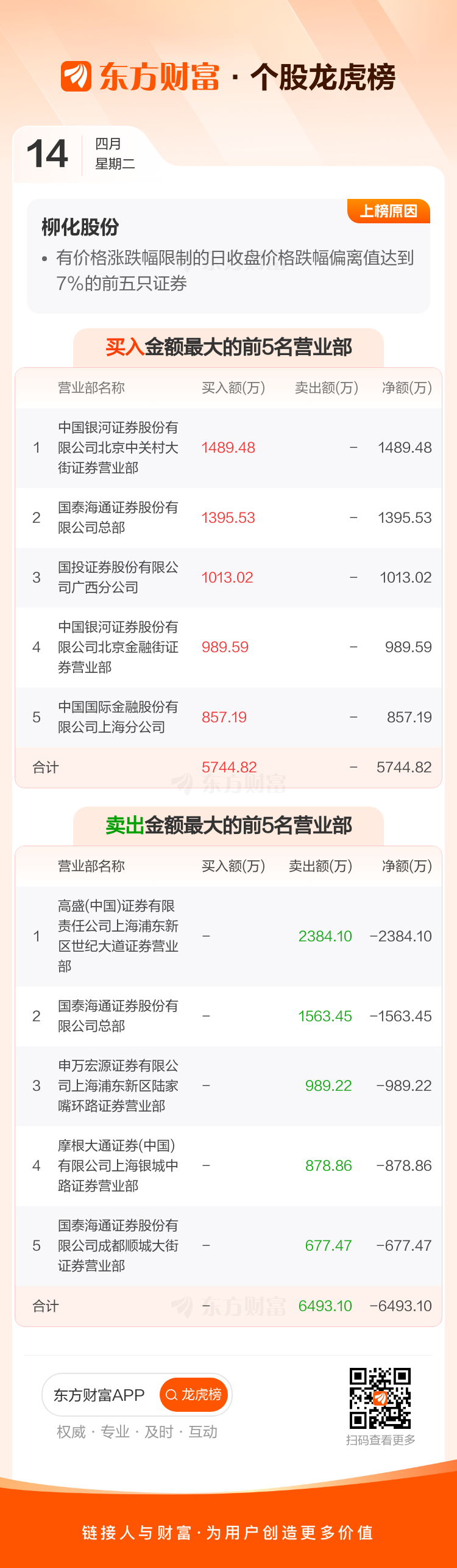 交易所2026年4月14日公布的交易公开信息显示,柳化股份因成为有价格涨跌幅限制的日收盘价格跌幅偏离值达到7%的前五只证券上榜。柳化股份当日收报2.98元,涨跌幅-7.17%,偏离值-8.12%,换手率15.38%,成交额3.72亿。