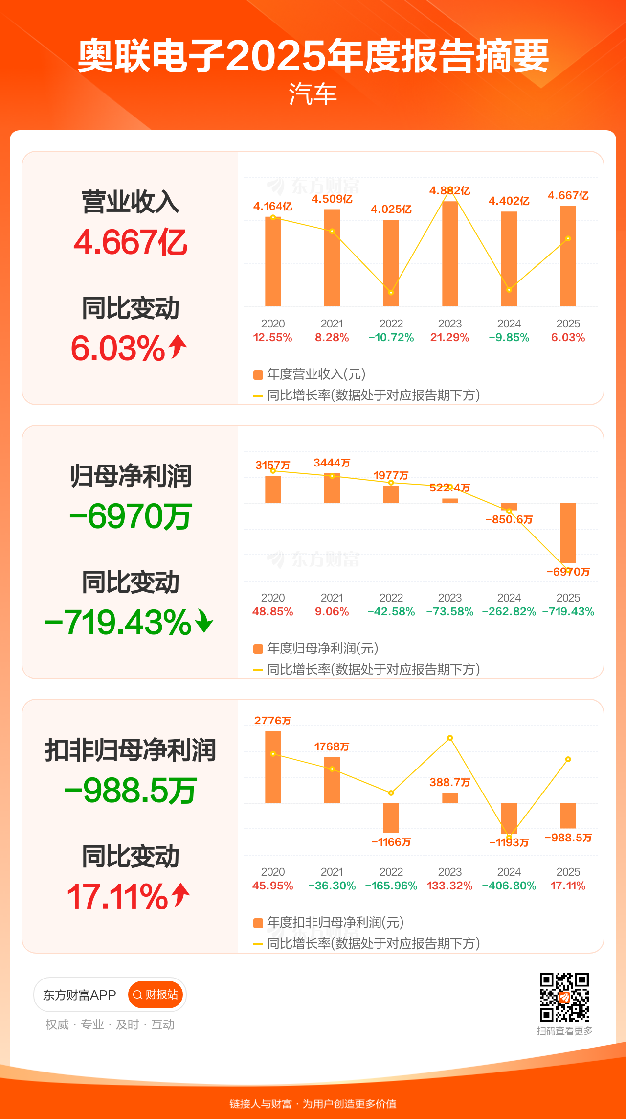 奥联电子4月15日发布2025年年报显示,公司全年实现营业收入4.67亿元,同比增长6.03%;归母净利润-6970.08万元;扣非归母净利润-988.54万元。