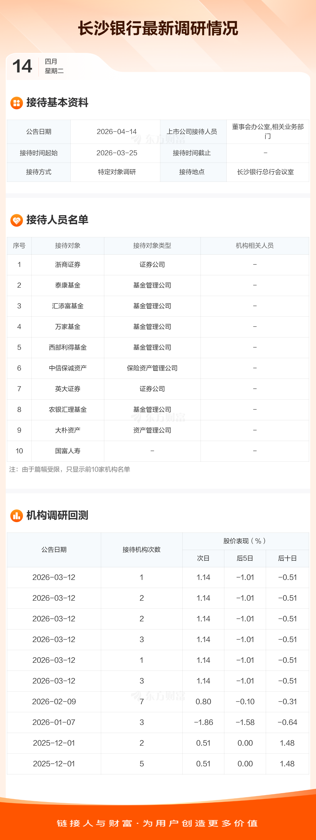 长沙银行4月14日公告称,3月25日接待浙商证券等16家机构调研。接待人员包括董事会办公室,相关业务部门。