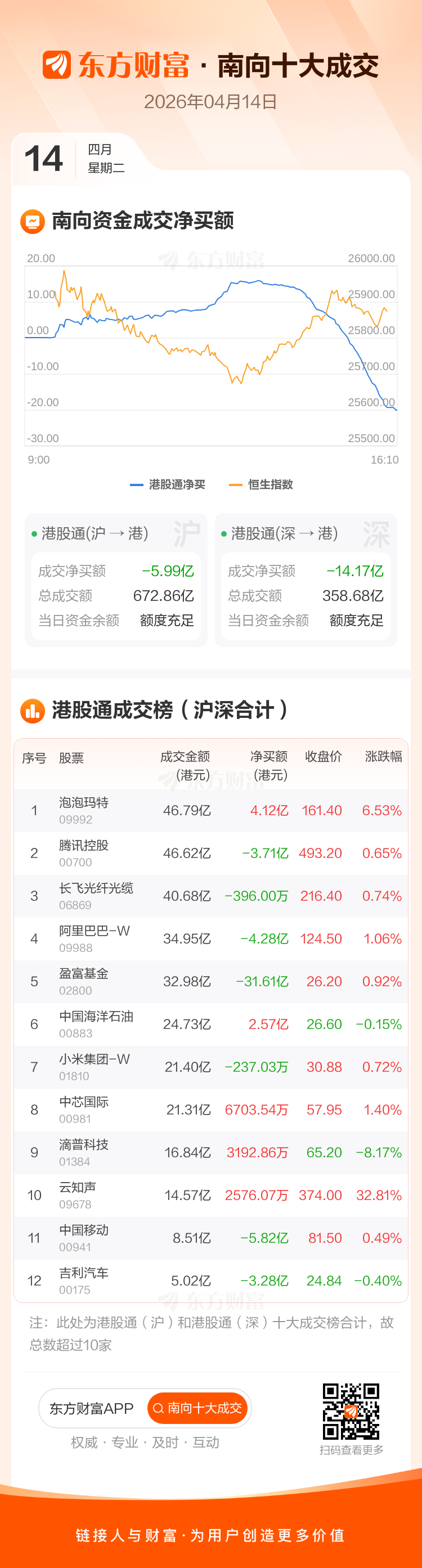 4月14日南向资金净卖逾20亿港元,逾4亿抢筹泡泡玛特