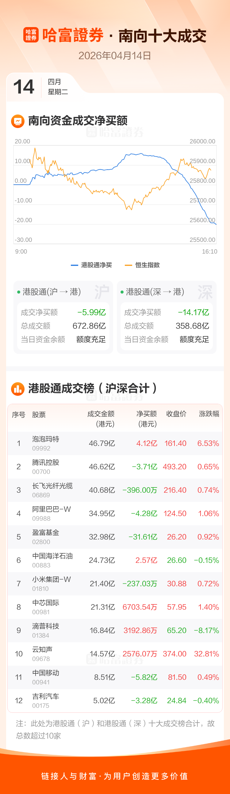 恒生指数4月14日涨0.82%,收报25872.32点。南向资金今日净卖出港股20.17亿港元。南向资金今日成交额1031.54亿港元,港股大市成交2367.76亿港元。