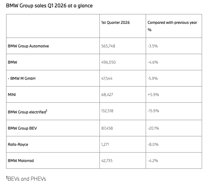 4月14日,宝马集团公布,2026年第一季度全球交付565,748辆宝马、MINI和劳斯莱斯品牌汽车,同比下降3.5%,其中宝马、MINI品牌在中国市场销量为143,958辆,同比下降10.0%。
