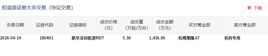 4月14日,鹏华深圳能源REIT大宗交易成交1436.8万股,成交额7725.67万元,占当日总成交额的91.11%,成交价5.38元,较市场收盘价5.377元溢价0.06%。