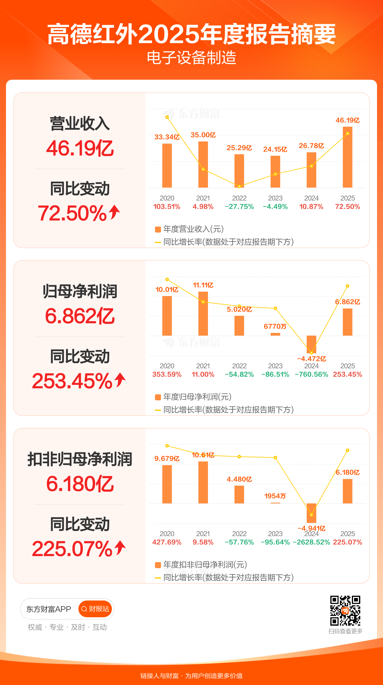 高德红外4月15日发布2025年年报显示,公司全年实现营业收入46.19亿元,同比增长72.50%;归母净利润6.86亿元,同比增长253.45%;扣非归母净利润6.18亿元,同比增长225.07%。
