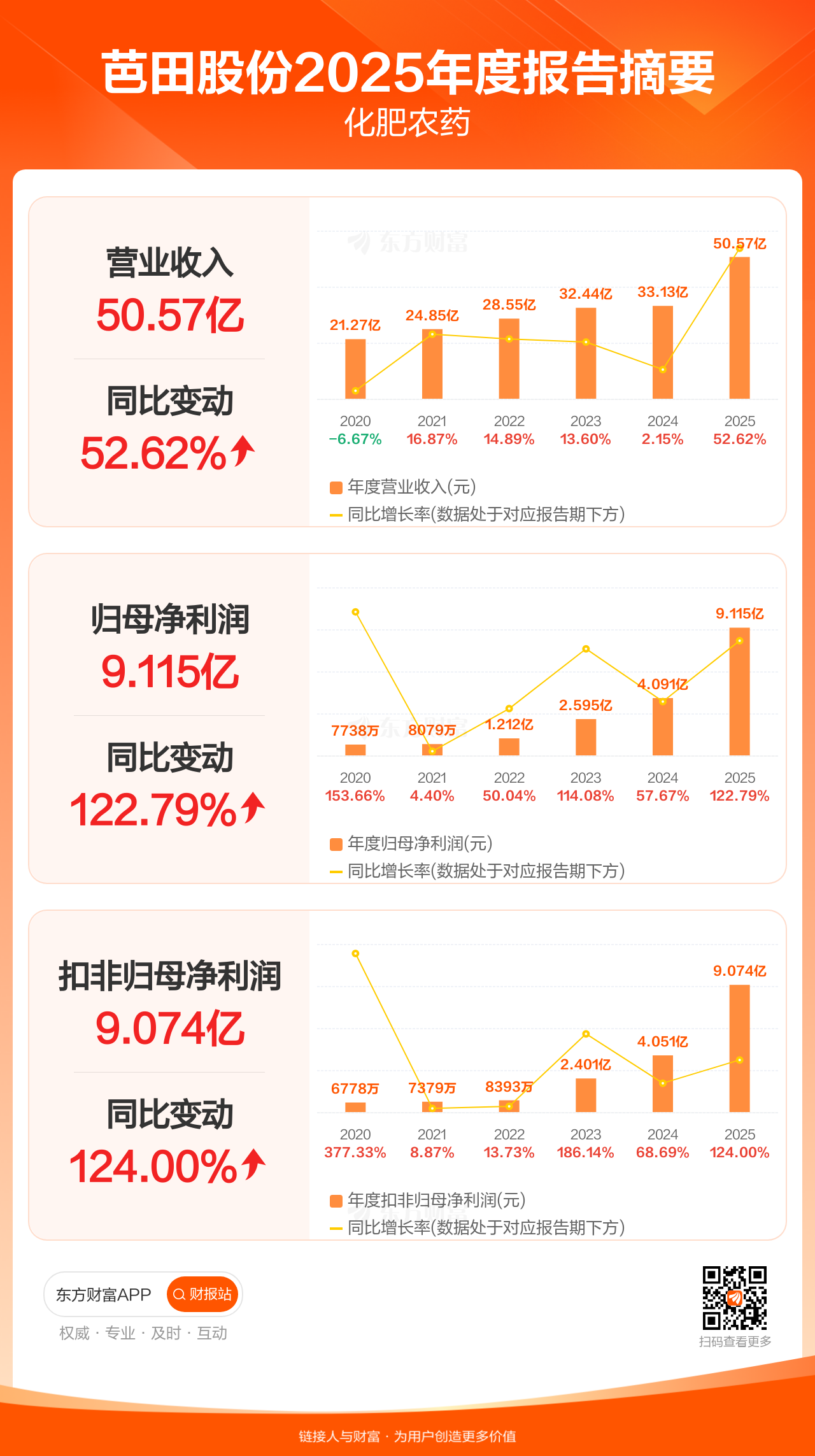 芭田股份4月15日发布2025年年报显示,公司全年实现营业收入50.57亿元,同比增长52.62%;归母净利润9.12亿元,同比增长122.79%;扣非归母净利润9.07亿元,同比增长124.00%。
