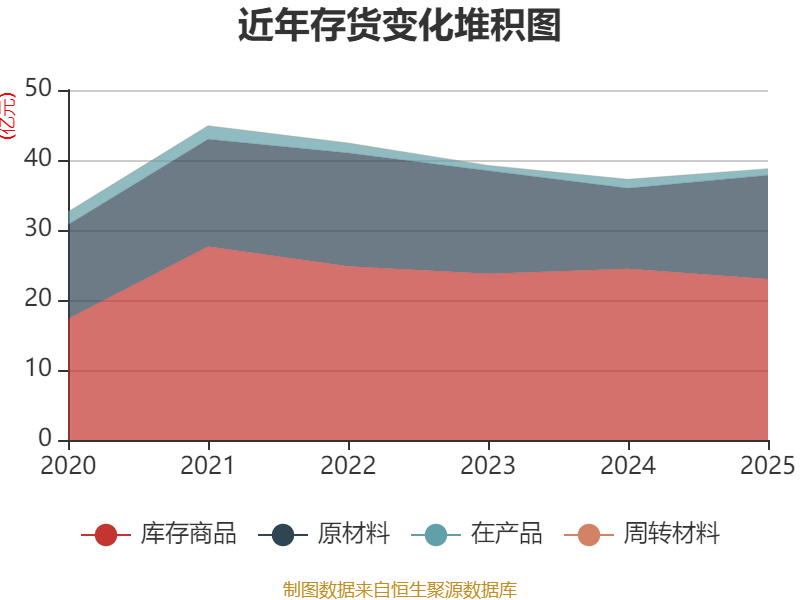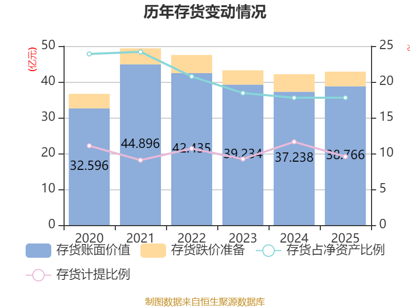 从存货变动来看,截至2025年末,公司存货账面价值为38.77亿元,占净资产的17.79%,较上年末增加1.53亿元。其中,存货跌价准备为4.1亿元,计提比例为9.56%。