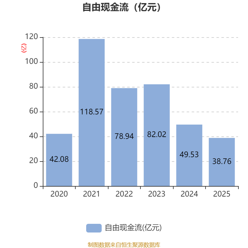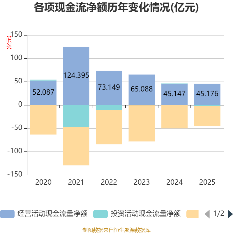 截至2025年,公司经营活动现金流净额为45.18亿元,同比增长0.06%;筹资活动现金流净额-42.45亿元,同比增加8.04亿元;投资活动现金流净额-2.69亿元,上年同期为7628.45万元。