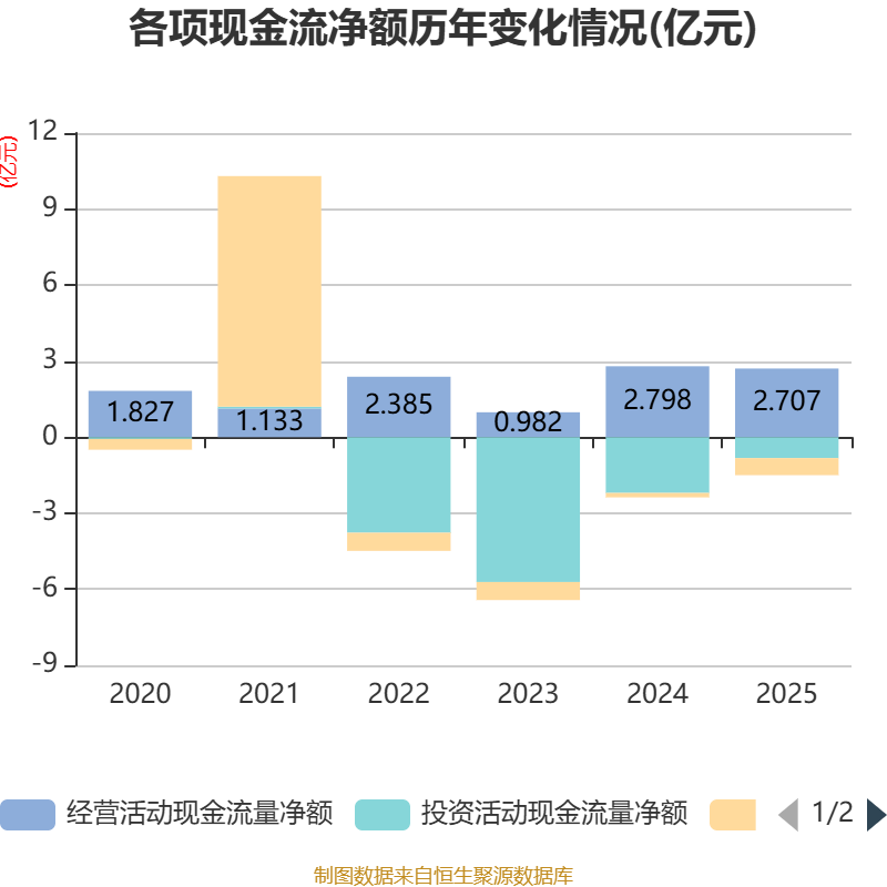 截至2025年,公司经营活动现金流净额为2.71亿元,同比下降3.26%;筹资活动现金流净额-6745.86万元,同比减少4998.77万元;投资活动现金流净额-8247.78万元,上年同期为-2.2亿元。