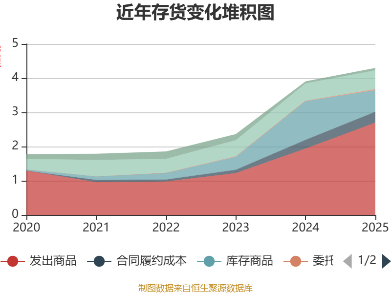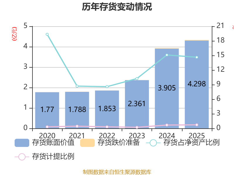 从存货变动来看,截至2025年末,公司存货账面价值为4.3亿元,占净资产的14.62%,较上年末增加3931.64万元。其中,存货跌价准备为312.85万元,计提比例为0.72%。