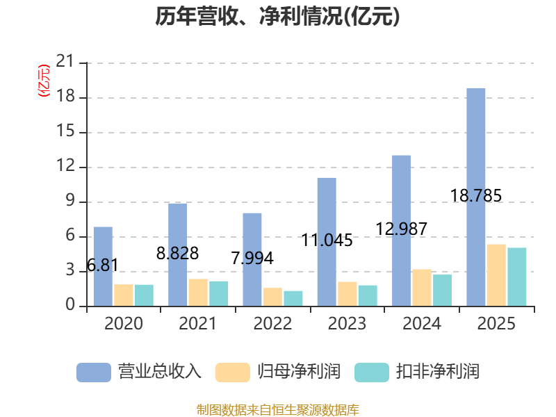 中证智能财讯中际联合(605305)4月15日披露2025年年度报告。2025年,公司实现营业总收入18.78亿元,同比增长44.64%;归母净利润5.30亿元,同比增长68.47%;扣非净利润5.01亿元,同比增长85.82%;经营活动产生的现金流量净额为2.71亿元,同比下降3.26%;报告期内,中际联合基本每股收益为2.5元,加权平均净资产收益率为19.11%。公司2025年度分配预案为:拟向全体股东每10股派现3.8元(含税)。