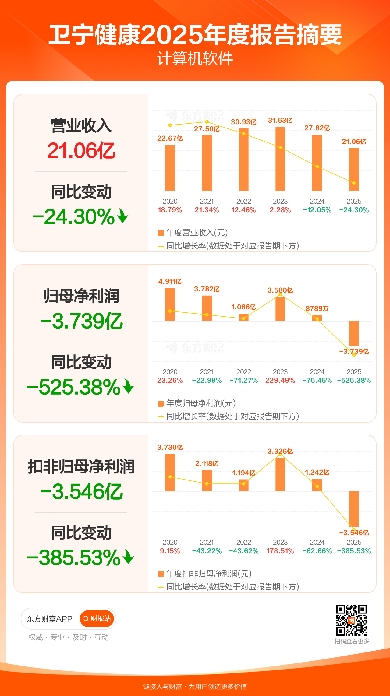 卫宁健康4月15日发布2025年年报显示,公司全年实现营业收入21.06亿元,同比下滑24.30%;归母净利润-3.74亿元;扣非归母净利润-3.55亿元。
