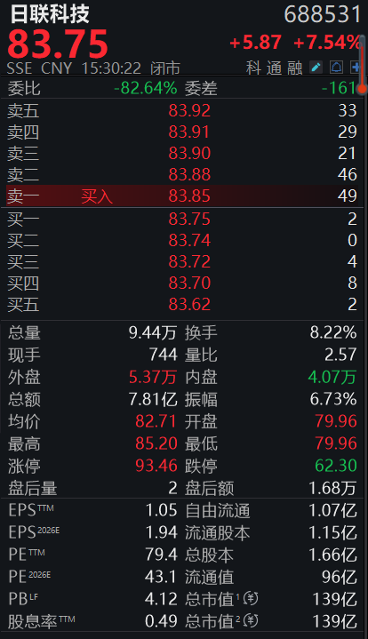 截至当日收盘,日联科技股价报83.75元,上涨7.54%,最新市值139亿元。